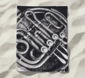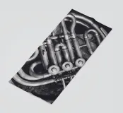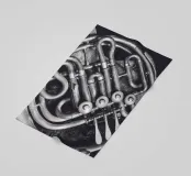 A detail shot of the pipes and valves of a French Horn.