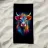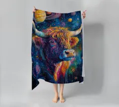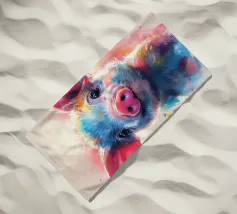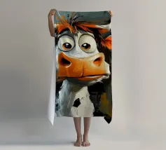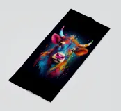 Un'impressionante pittura digitale di una mucca caratterizzata da colori vivaci e audaci che si fondono perfettamente con un effetto di schizzi di vernice. La resa artistica combina realismo e astrazione, creando una composizione surreale e accattivante su uno sfondo scuro.