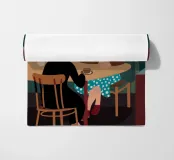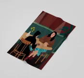 Un'illustrazione intima che cattura un momento di tranquillità tra due persone sedute a un tavolino di un bar. L'illuminazione calda e tenue e la loro interazione concentrata creano un racconto di conversazione e connessione, rappresentativo della vita sociale moderna.