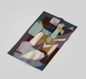 A cubist-style painting with fragmented shapes and a muted color palette. The artwork evokes complexity and depth.