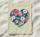 Motivo tropicale Hibiscus in stile hawaiano creato digitalmente a forma di cuore. Magenta, avorio, blu, verde e giallo, motivo vintage tropicale.