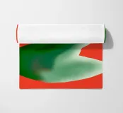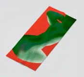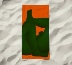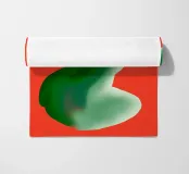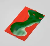 Una forma astratta verde assume una posa dinamica su uno sfondo arancione vibrante, creando un contrasto audace e un impatto visivo sorprendente. La figura sembra essere seduta, con un'enfasi sulle curve morbide e sui gradienti.