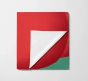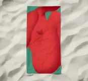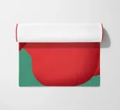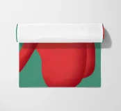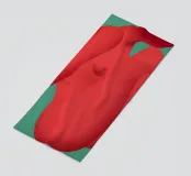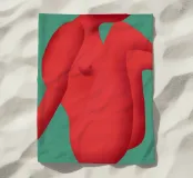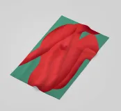 Una rappresentazione stilizzata di una forma umana mostra una vibrante tonalità di rosso su uno sfondo verde a contrasto. L'approccio astratto e minimalista mette in evidenza le curve e crea un senso di movimento attraverso l'uso di colori e forme.