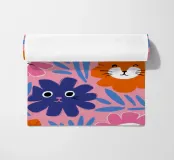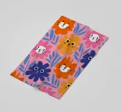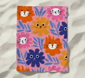 A cute and playful seamless pattern of colorful cat faces and flowers against a pink background. The design is charming and perfect for kids.