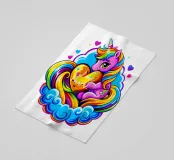Questo adorabile unicorno, che risplende nei colori neon dell'arcobaleno, stringe un cuore stellato e fluttua su una soffice nuvola di stravagante felicità. Con i suoi grandi occhi scintillanti e una criniera che abbaglia in uno spettro di tonalità brillanti, questo disegno sembra una magica fuga in una terra dove i sogni diventano realtà. È perfetto per aggiungere una ventata di energia giocosa a qualsiasi spazio o oggetto che decora. Che siate giovani o giovani di cuore, questo allegro unicorno è qui per ricordarvi di abbracciare la magia che è in voi e di agire sempre con amore.