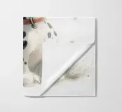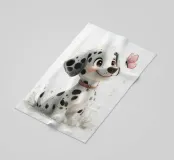 Un simpatico cucciolo di dalmata gioca felice in un prato fiorito, circondato da una farfalla e da fiori in un'incantevole illustrazione ad acquerello.