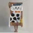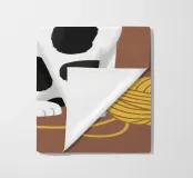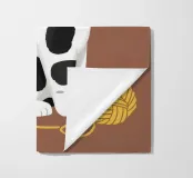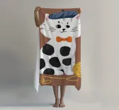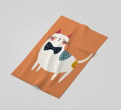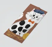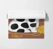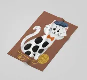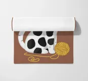 Un'affascinante illustrazione di un gatto bianco con macchie nere, che indossa un papillon rosso e una benda per gli occhi e interagisce giocosamente con un gomitolo di filo giallo. Lo sfondo è di un marrone tenue, che mette in risalto la personalità eccentrica e adorabile del gatto.