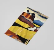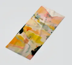 Colori vivaci e forme astratte formano una scena di paesaggio, con strati distinti che rappresentano il terreno e il cielo. La parte superiore è caratterizzata da alberi stagliati su uno sfondo con dolci sfumature, che suggerisce una lontana catena montuosa sotto un cielo crepuscolare.