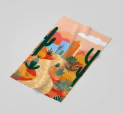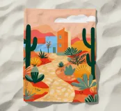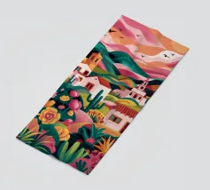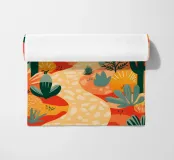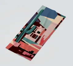 Un paesaggio desertico è caratterizzato da un sentiero tortuoso che conduce a una piccola casa, circondata da cactus e varie piante del deserto. I toni caldi dell'arancione e del rosa riempiono il cielo e lo sfondo, dando l'impressione di un tramonto sereno.