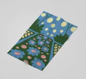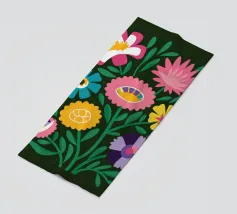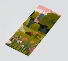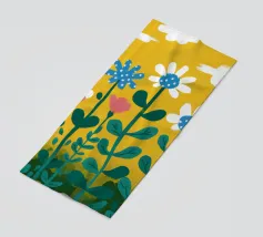 Un allegro disegno di giardino fiorito con una combinazione di colori vivaci e forme semplici, che crea un'atmosfera deliziosa.
