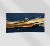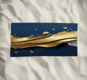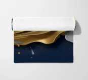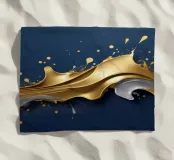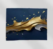 Una composizione astratta che mostra onde dinamiche di oro e argento, intrecciate con spruzzi vibranti su uno sfondo blu profondo, ideale per sfondi desktop e sfondi artistici.