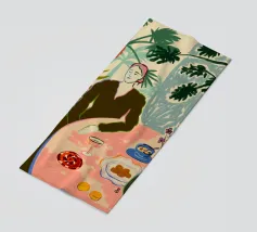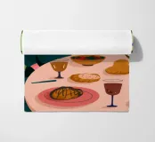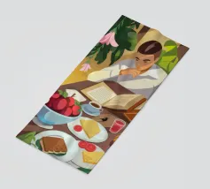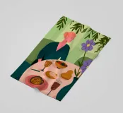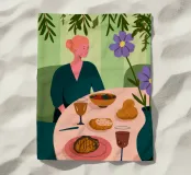 Questo dipinto illustra una persona seduta a un tavolo da pranzo con vari cibi e bevande, tra cui pane, vino e una ciotola di zuppa. Lo sfondo è caratterizzato da grandi foglie e fiori verdi.