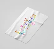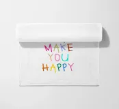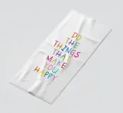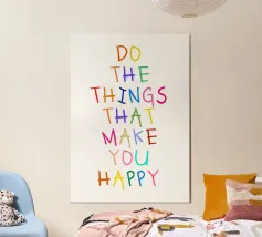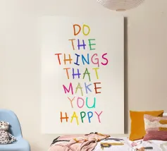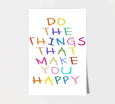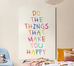 Questo disegno edificante presenta il messaggio positivo "Fai le cose che ti rendono felice" scritto con i colori vivaci e giocosi dell'arcobaleno. L'audace scrittura a mano crea un look allegro e moderno, rendendolo un perfetto pezzo di arte murale motivazionale.
