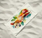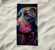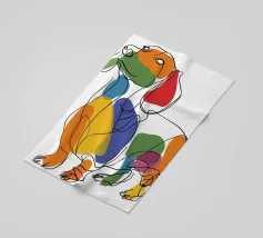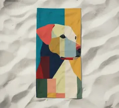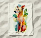Una vivace illustrazione artistica di un cane seduto composta da forme geometriche sovrapposte in toni audaci e multicolori, con elementi astratti di foglie sullo sfondo, che creano un design moderno e accattivante.