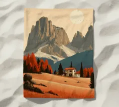Design da viaggio minimalista delle Tre Cime, di un escursionista e di un noto rifugio nelle Dolomiti, che si trovano nella parte italiana delle Alpi e sono una destinazione di vacanza popolare per gli escursionisti e gli alpinisti.