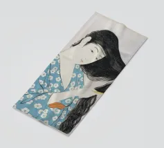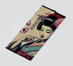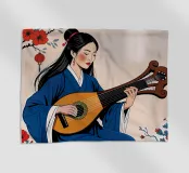 Giovane donna orientale in kimono blu suona un liuto seduta tra fiori e lanterne rosse.