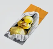 Un simpatico anatroccolo fa capolino da sotto un morbido asciugamano bianco. Le sue soffici piume gialle e i suoi occhi curiosi creano una scena adorabile e affascinante.