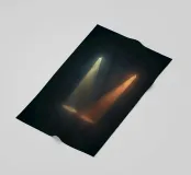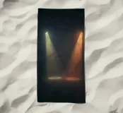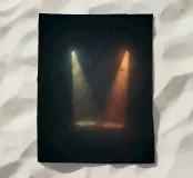 Morbidi fasci di luce dorata e arancione tagliano la fitta nebbia, proiettando macchie circolari sul pavimento del palcoscenico, creando un'atmosfera drammatica per uno spettacolo.