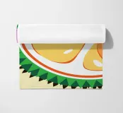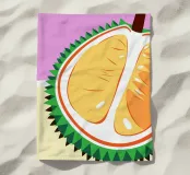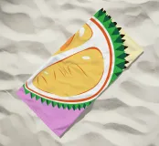 Illustrazione che mostra un frutto di durian spaccato, con un cielo blu e nuvole sullo sfondo.