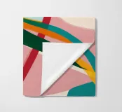A dynamic and harmonious abstract composition features flowing lines and shapes in a palette of teal, orange, pink, and white, creating a sense of balanced and elegant movement.
