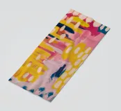 An abstract composition with a vibrant yellow and pink background, overlaid with dense, grid-like patterns of black, blue, and white short lines or dots, creating a sense of shimmering texture or an abstracted digital landscape.