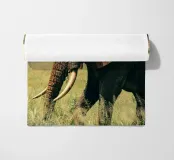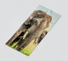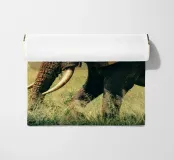 The elephant slowly sways its massive body as it grazes, pulling up tufts of fresh green grass with its strong trunk. Its gentle eyes and calm movements reflect a quiet strength, while the rhythm of its feeding echoes the peaceful harmony of the wild.”