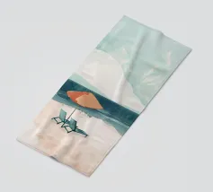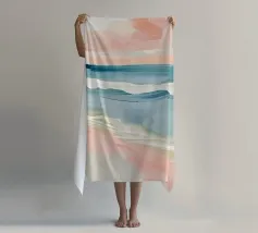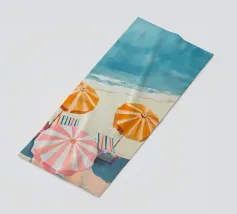 A serene illustration of a quiet beach, bathed in warm tones. Sun hats rest in the sand, and rustic huts complete the peaceful scene—capturing the essence of slow summer days.