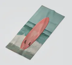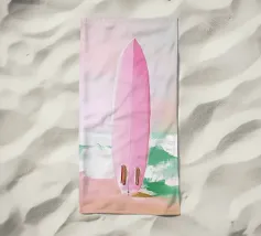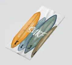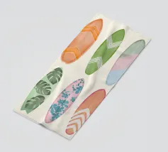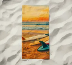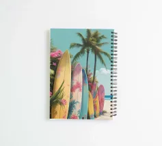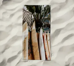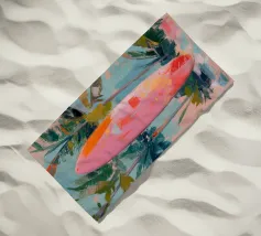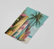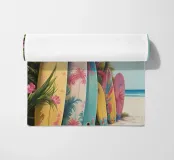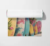 Vibrante arte da spiaggia tropicale con colorate tavole da surf vintage, palme e cieli pastello. Un omaggio nostalgico alla cultura del surf e alla libertà estiva.