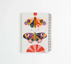 Una disposizione simmetrica di due farfalle colorate su una forma geometrica a ventaglio, che unisce la natura al design moderno.
