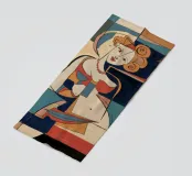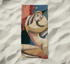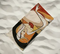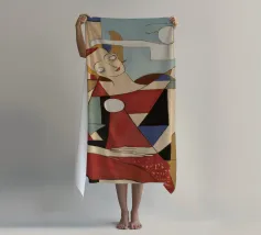 Questo dipinto raffigura una figura in posa giocosa, circondata da forme geometriche e colori vivaci. La composizione evidenzia la gioia e la spontaneità della scena.