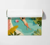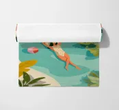 La luce del sole filtra attraverso le foglie tropicali mentre lei galleggia tranquillamente in una piscina, completamente a suo agio. Il mondo intorno a lei si dissolve in colori tenui e forme tranquille: palloni da spiaggia, sandali e il tempo stesso vengono lasciati alle spalle. Questo pezzo è un'espirazione visiva che ricorda di fermarsi, respirare e lasciare che il riposo sia sufficiente.
