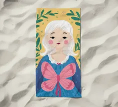 Questa illustrazione mostra una persona con i capelli bianchi che indossa un abito blu con una grande farfalla rosa sul petto. Lo sfondo è ornato da foglie verdi, che creano un'atmosfera serena e graziosa.