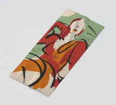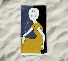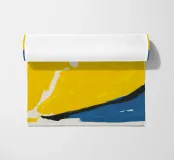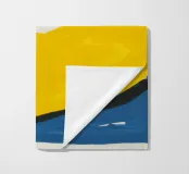 Una rappresentazione astratta e pittorica di una figura sdraiata in audaci ed espressivi tratti di giallo su uno sfondo blu scuro, che celebra la forma umana con grazia minimalista e colori vibranti.