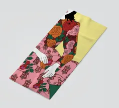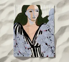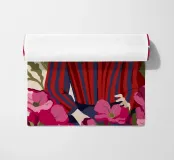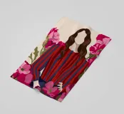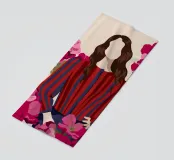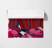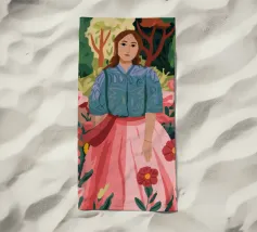 Un dipinto di una persona con un vestito a righe rosse e blu, circondata da fiori rosa.