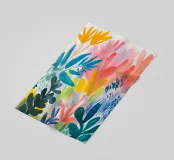 Vibrant foliage in various shades of blue, pink, and yellow creates a lively and colorful depiction of nature. The abstract forms overlap and blend, suggesting a lush and diverse garden scene.