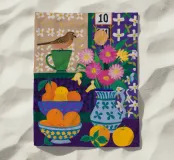 Un'affascinante e colorata natura morta di arte popolare raffigura un vaso di fiori, una ciotola di arance e un piccolo uccello, tutti resi con motivi intricati e uno stile naif.