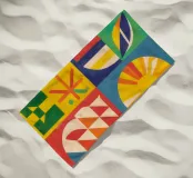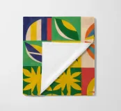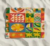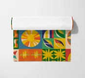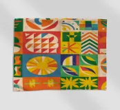 Un motivo vivace e intricato che ricorda una trapunta, composto da vari quadrati con simboli e disegni geometrici ispirati all'arte popolare. La ricca tavolozza di colori crea un'atmosfera calda e artigianale.