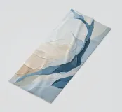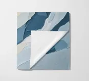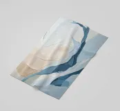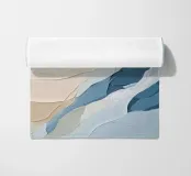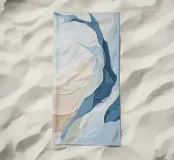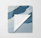 Pittura a olio astratta con forme bianche e blu chiaro, completate da beige, blu navy e grigio su uno sfondo chiaro. Curve e pennellate delicate creano una composizione minimalista e moderna con una superficie strutturata.