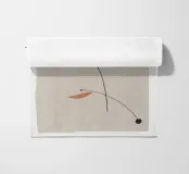 Le forme astratte sono collegate da sottili linee nere su uno sfondo beige chiaro, creando un senso di equilibrio. La composizione presenta varie forme geometriche in diversi colori, tra cui marrone, rosso, blu, bianco e giallo.