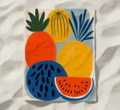 Frutta fresca e colorata da afferrare: Questa vibrante composizione unisce i frutti tropicali in un insieme armonioso. La tavolozza vibrante - arancione brillante, giallo solare, blu profondo e verde lussureggiante - trasmette una voglia di vita mediterranea. Le forme stilizzate oscillano tra astrazione e figurazione: melone, ananas, arancia e frutti esotici sono disposti in uno splendore decorativo. Lo stile pittorico bidimensionale e i motivi grafici mostrano influenze del design scandinavo e dei Papiers découpés di Matisse. Vitamine per gli occhi e puro umorismo estivo per ogni parete.