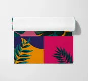 Una composizione sofisticata combina blocchi di motivi di foglie tropicali con campi di colore pieno e forme geometriche. Il disegno patchwork nei toni del blu, del rosa e del verde crea un pezzo equilibrato ed elegante, moderno e naturale al tempo stesso.