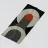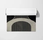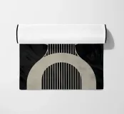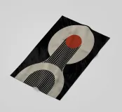 Una composizione geometrica presenta un grande cerchio intersecato da linee verticali, sormontato da un audace cerchio rosso. Gli elementi monocromatici contrastano con uno sfondo scuro e vorticoso.