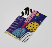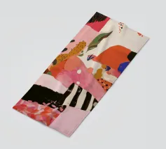 Un collage astratto vibrante ed eclettico caratterizzato da un mix di motivi audaci, tra cui righe, stampa ghepardo e pois. La composizione è un'espressione giocosa ed energica di uno stile moderno bohémien o massimalista.