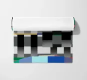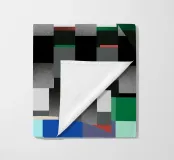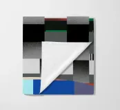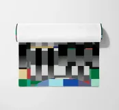 Forme geometriche audaci dominano la composizione, caratterizzata da un mix di colori e motivi come strisce e disegni a scacchi. La disposizione crea un'esperienza visiva vibrante e dinamica.