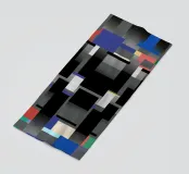 Le forme geometriche formano un motivo pixelato con un mix di nero, grigio e colori vivaci come rosso, blu e verde. Il design ha un'estetica digitale e moderna con linee orizzontali e verticali a contrasto.