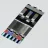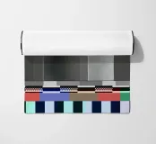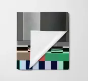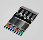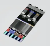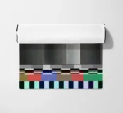 Un motivo digitale mostra una serie di forme geometriche con una varietà di colori che ricordano lo schermo di un televisore. Linee parallele e rettangoli creano una composizione strutturata e vibrante.