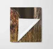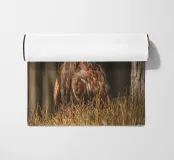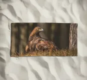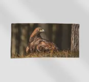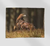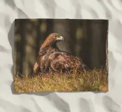 A Golden Eagle perched on autumnal woodland floor.
