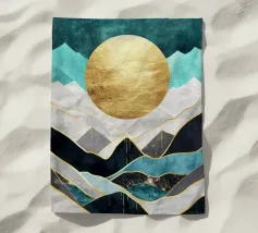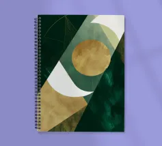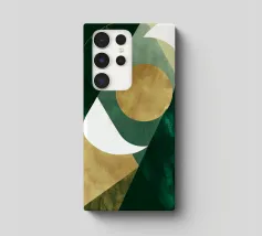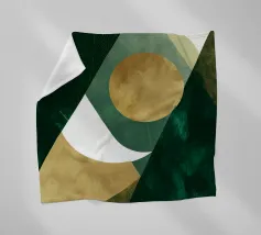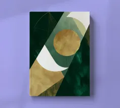 Un'opera d'arte astratta moderna che cattura la tensione poetica tra il sole e la luna, composta da audaci forme geometriche in verde bosco profondo, oro caldo e avorio morbido. Questo pezzo elegante conferisce un'aura mistica e senza tempo a qualsiasi spazio, ideale per gli amanti del design minimalista con sfumature simboliche.
