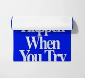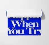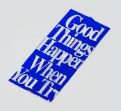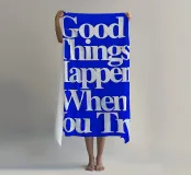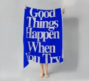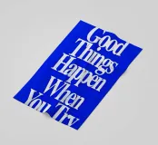 "Il messaggio edificante 'Good Things Happen When You Try' (Le cose belle accadono quando ci provi), presentato in una tipografia testurizzata di colore bianco sporco su uno sfondo blu vibrante, crea un senso di speranza e incoraggiamento. La texture leggermente rovinata aggiunge un tocco vintage e accessibile al design",