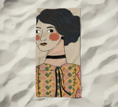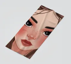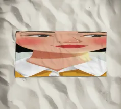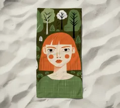 Un ritratto semplice e grafico di una ragazza con capelli corti e neri e guance rosee, che indossa un top verde, con un'espressione diretta e leggermente imbronciata su uno sfondo bianco.